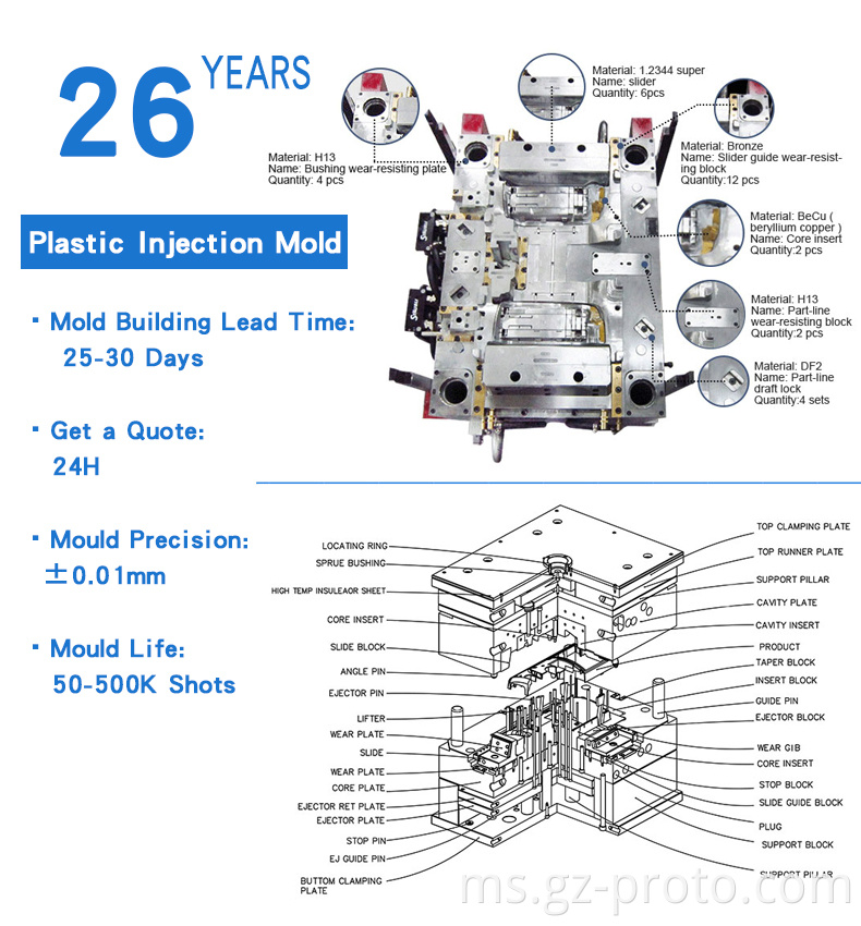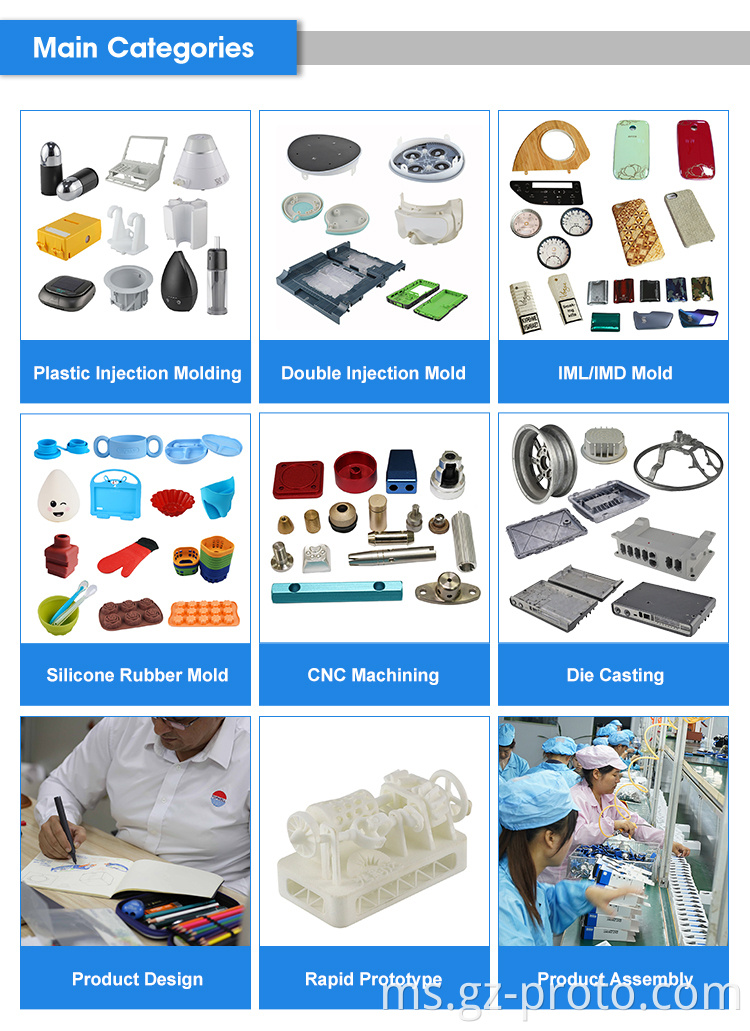 Kita boleh membuat pelbagai jenis acuan, seperti acuan suntikan plastik, acuan meniup, stampings, acuan stamping, acuan pemutus mati dan acuan getah silikon. Selain itu, kami juga boleh menghasilkan bahagian akhir untuk anda.